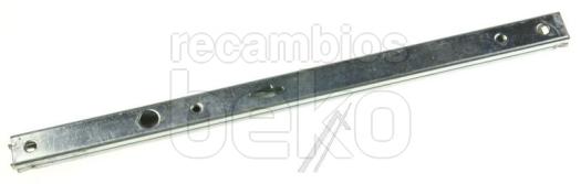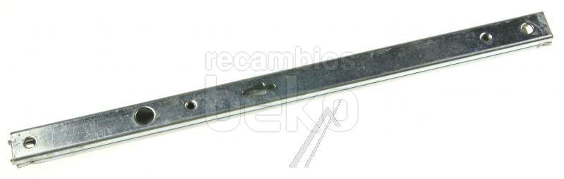 Guía corredera metálica para campanas extractoras Beko, válida para montaje en lado izquierdo o derecho. Se trata de un riel deslizante alargado, recto y de color plateado uniforme, con perforaciones y ranuras de fijación distribuidas a lo largo de toda su longitud para asegurar un anclaje firme a la estructura de la campana. Diseñada como pieza de desplazamiento o soporte interno, permite el correcto movimiento o posicionamiento de componentes móviles de la campana extractora.