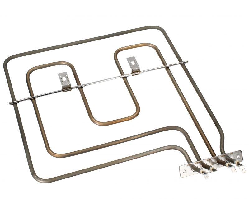 Resistencia superior de horno Beko de 1600W y 230V, específica para hornos y cocinas de la marca Beko. Elemento calefactor de tipo superior con forma de doble marco rectangular y fijación central mediante una pequeña placa metálica unida a dos bornes de conexión. Longitud total aproximada de 340 mm, ancho 300 mm, altura 35 mm, con brida de 100 mm de largo y 18 mm de ancho. No incorpora termostato ni fusible térmico.