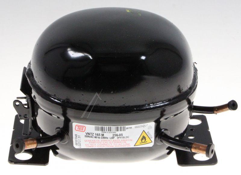 Compresor inverter original Beko para frigoríficos y congeladores, modelo VNTZ165MT, diseñado para funcionar con gas refrigerante R600a y alimentación de 220V/60Hz. Presenta un cuerpo metálico de color negro brillante con forma cilíndrica ovalada, montado sobre una base con soportes de fijación y conexiones de cobre visibles en un lateral. Adecuado para sistemas de refrigeración que utilicen tecnología inverter.