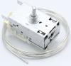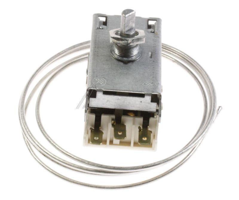 Termostato de frigorífico Beko para controlar la temperatura en frigoríficos y congeladores de la misma marca. Pieza metálica plateada con carcasa rectangular y eje giratorio frontal para el ajuste, acompañada de un tubo capilar largo y delgado de 895 mm enrollado en espiral para la detección de la temperatura en el interior del aparato.