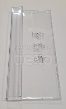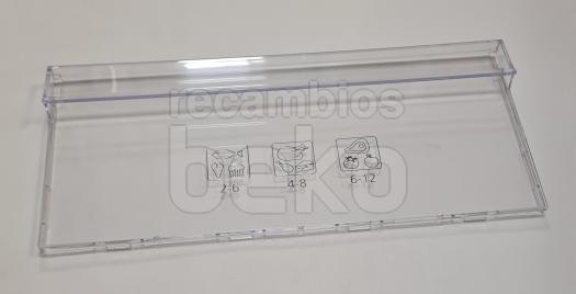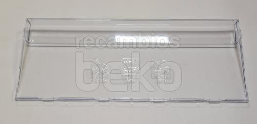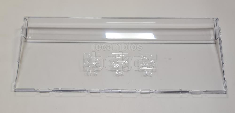 Tapa frontal de cajón para frigoríficos y congeladores Beko, diseñada como cubrecajón rectangular y transparente con una altura aproximada de 19 cm. La pieza es totalmente lisa e incolora, con un ligero reborde perimetral que refuerza la estructura y facilita su correcta colocación en el cajón del frigorífico. Sustituye la tapa frontal original del cajón, permitiendo mantener la visibilidad del contenido y el cierre adecuado del compartimento.