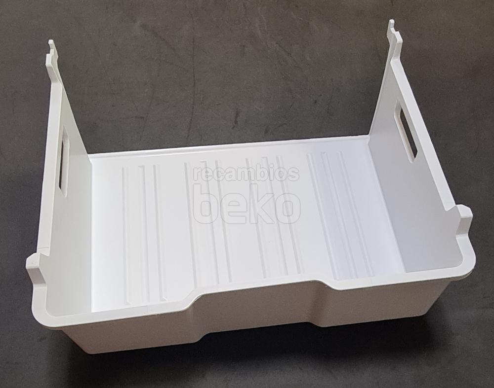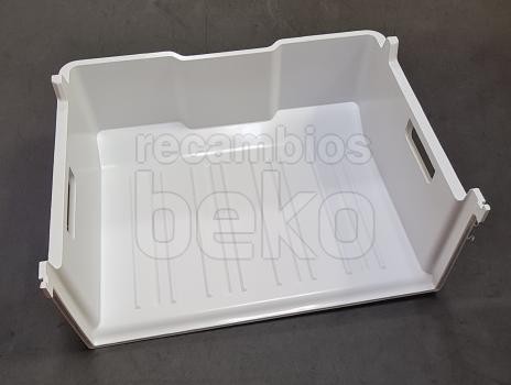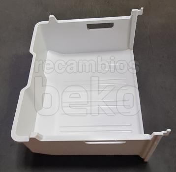 Cuerpo de cajón de congelador original para aparatos de la marca Beko, diseñado para su uso en frigoríficos y congeladores. Se trata de un cajón de plástico blanco, sin tapa ni frontal, con forma rectangular y paredes totalmente lisas del mismo color para facilitar la visibilidad del contenido. Esta es la nueva versión del cajón; para completarlo es necesario solicitar por separado el frontal con referencia BEK008446. Pieza específica para la zona de congelador, destinada a la organización y almacenamiento de alimentos congelados.