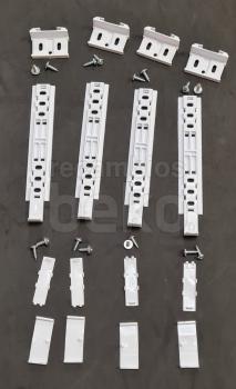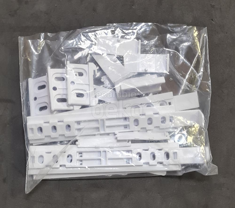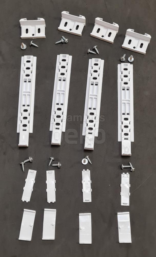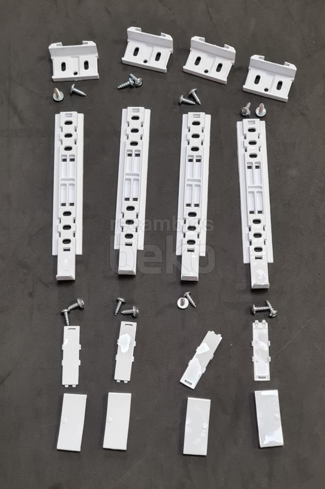 Minikit deslizador de puerta para frigoríficos y congeladores Beko. Conjunto de varias piezas rectangulares y alargadas de plástico blanco, con orificios y pequeñas guías integradas que permiten el correcto deslizamiento y sujeción de la puerta. Diseñado específicamente como componente de junta o sistema de deslizamiento de la puerta del frigorífico, garantiza el movimiento lineal de la hoja en el marco del aparato.