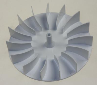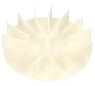 Rotor de ventilador radial original para frigoríficos y congeladores Beko. Pieza de forma circular con múltiples palas rectas dispuestas en anillo alrededor de un eje central, diseñada para impulsar el aire frío en el interior del aparato y asegurar una correcta circulación. Fabricado en plástico blanco ligero y resistente, se monta sobre el eje del motor del ventilador en el compartimento de refrigeración o congelación.