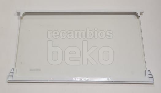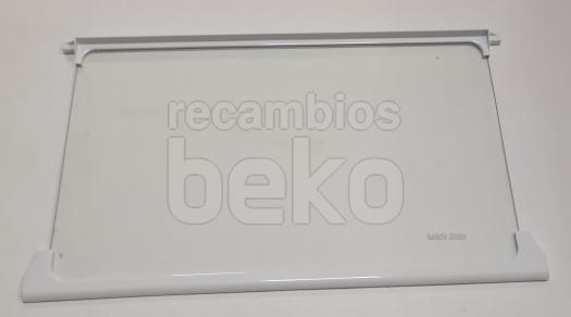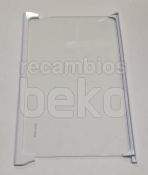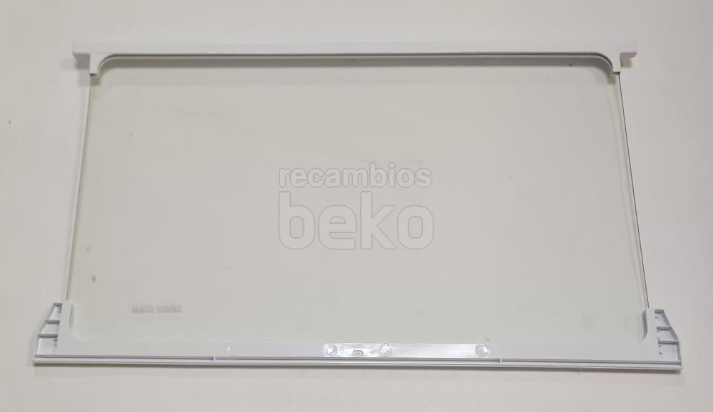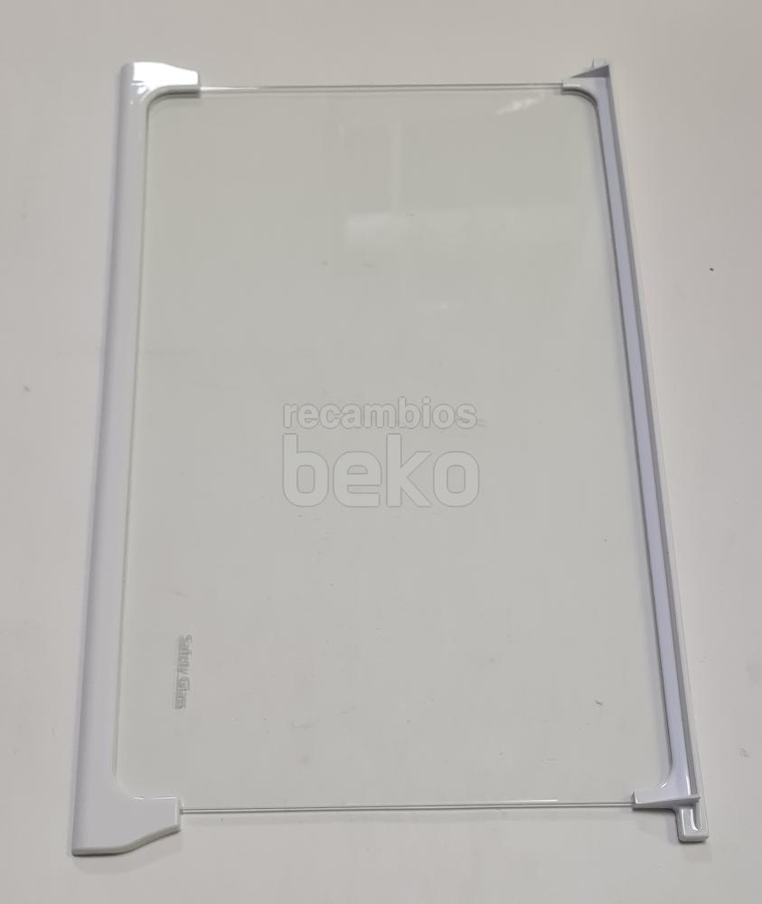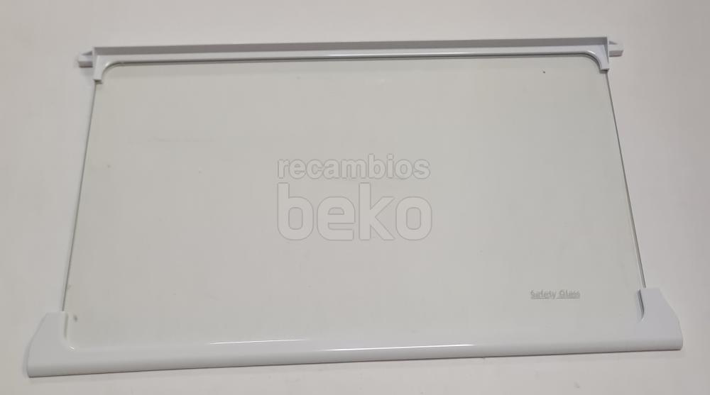 Estante interior de cristal Safety Glass compatible con frigoríficos y congeladores Beko. Está formado por un panel de cristal transparente e incorpora perfiles blancos en la parte delantera y trasera. Diseñado como balda interior para organizar y sostener alimentos y recipientes dentro del aparato.