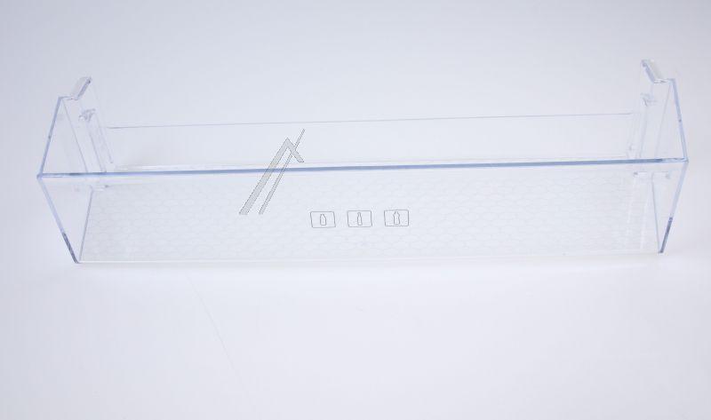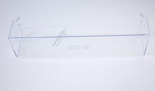Estante botellero para puerta de frigorífico Beko, diseñado para alojar botellas en la parte inferior de la contrapuerta. Pieza alargada y rectangular con frontal ligeramente curvado, que ayuda a sujetar las botellas y evitar que se desplacen. Fabricado en plástico transparente de una sola pieza y de color uniforme, permite ver fácilmente el contenido almacenado.