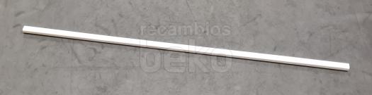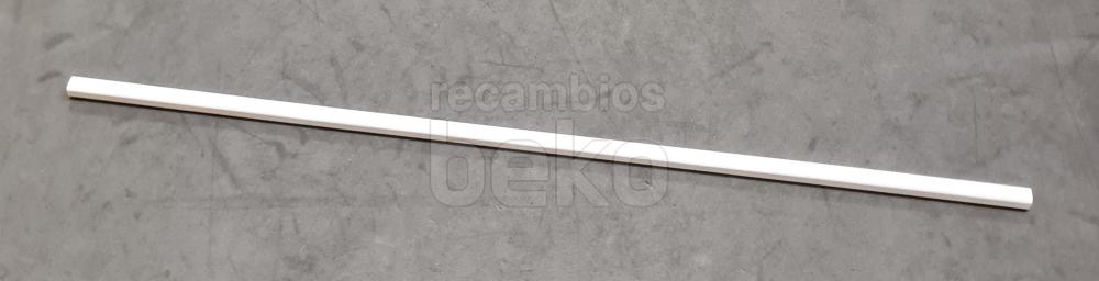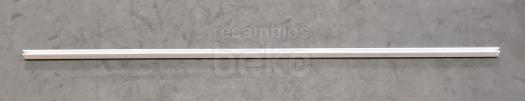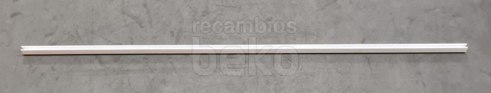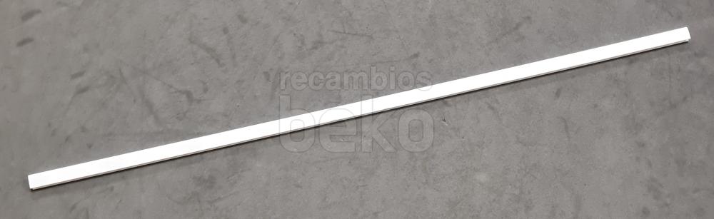 Perfil frontal embellecedor para estante interior de frigorífico Beko, diseñado para cubrir y rematar el borde delantero de un estante de cristal. Es una pieza alargada y recta, de plástico blanco, con superficie lisa y uniforme en todo su largo. Funciona como placa frontal del estante, aportando un acabado limpio y ayudando a mantener estable el borde del cristal. Compatible con frigoríficos y congeladores de la marca Beko en la zona de estantes interiores.