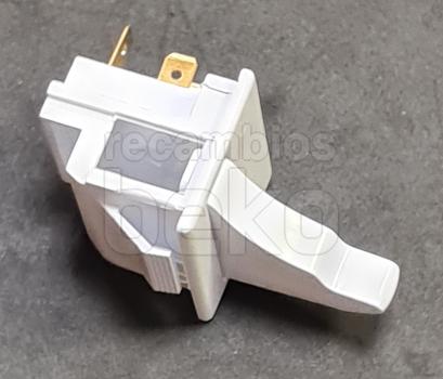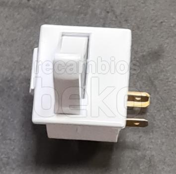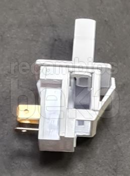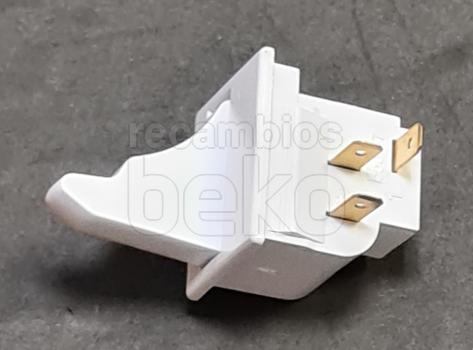 Interruptor de puerta para la luz interior de frigoríficos Beko. Pieza de plástico blanco, de forma rectangular, con pulsador saliente frontal que se acciona al abrir o cerrar la puerta. En la parte trasera dispone de dos terminales metálicos para la conexión eléctrica. Diseñado para montarse en el marco de la puerta y activar o desactivar la iluminación interna del aparato al cerrar o abrir la puerta.