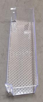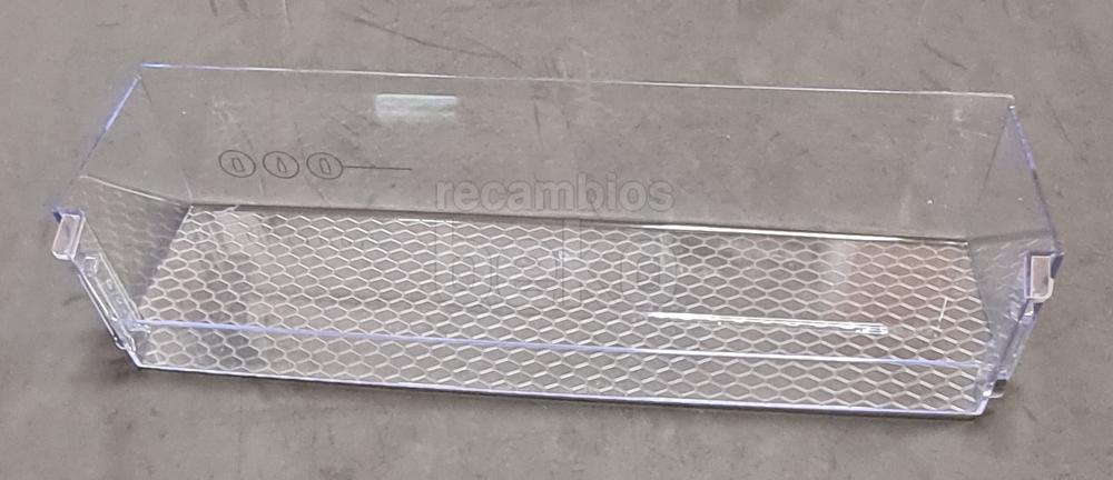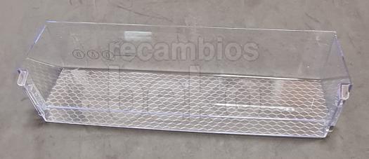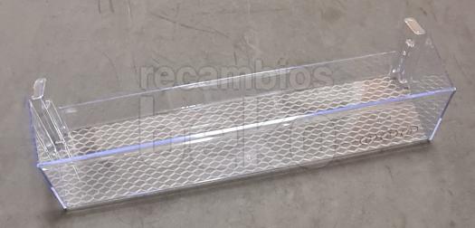 Botellero inferior original Beko para puerta de frigorífico. Estante de plástico transparente, de forma rectangular alargada, con base lisa para apoyar botellas y frontal ligeramente curvado para una mejor sujeción. Diseñado para instalarse en la parte inferior de la puerta del frigorífico, permite organizar botellas y envases altos.