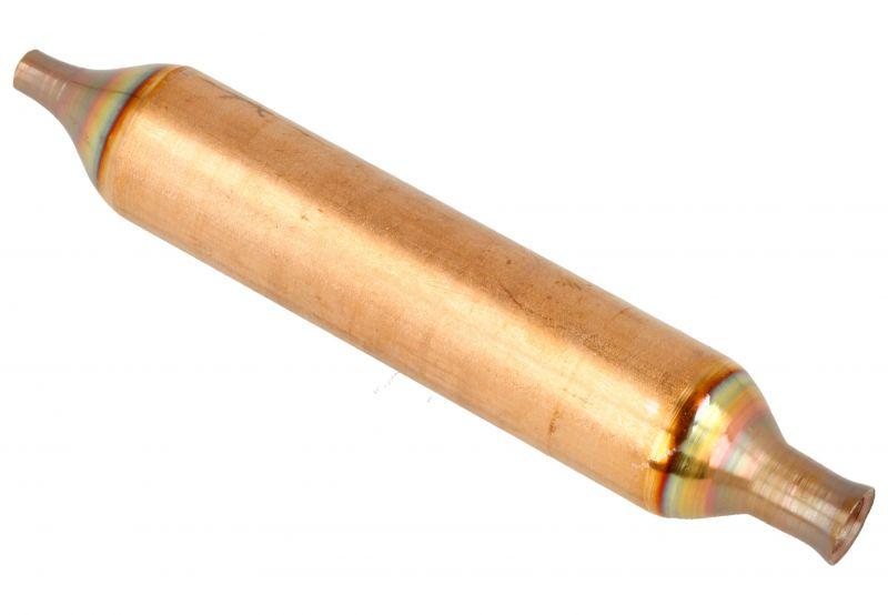 Deshidratador metálico recto y alargado para frigoríficos y congeladores Beko. Pieza interna de color cobre, con un tramo central más grueso y extremos más estrechos, diseñada para el circuito de refrigeración del aparato. Se utiliza como recambio específico para mantener el correcto funcionamiento del sistema frigorífico.