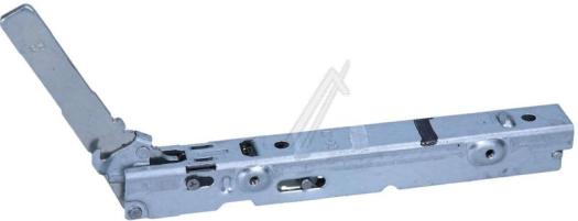 Bisagra de puerta para horno Beko, fabricada en metal de color gris plateado. Conjunto articulado con varias piezas móviles y orificios de fijación para su montaje en la puerta del horno, diseñada para asegurar la apertura y cierre correctos de la puerta del aparato.