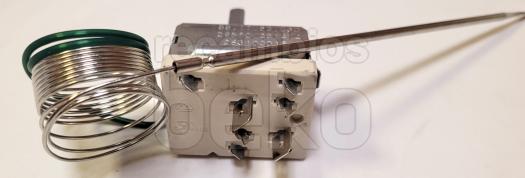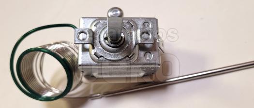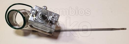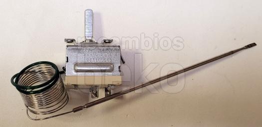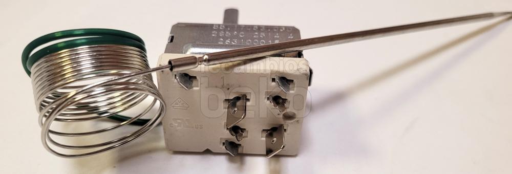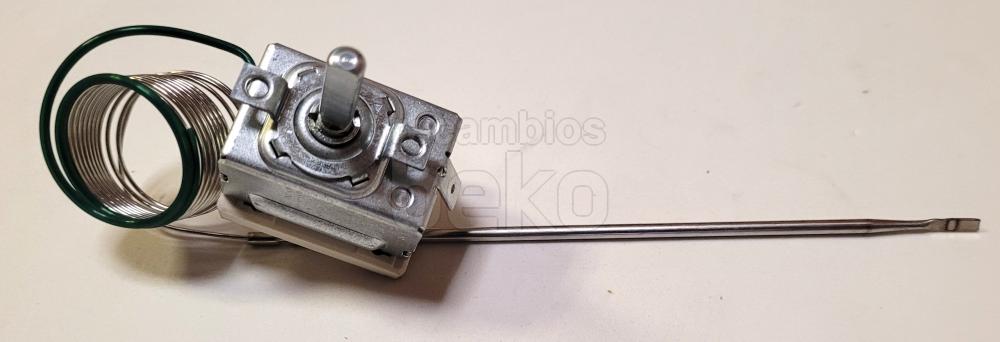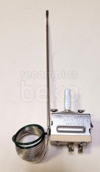 Termostato de horno EGO compatible con hornos BEKO. Pieza metálica plateada con cuerpo rectangular y eje frontal para el ajuste de temperatura. Incorpora una larga sonda capilar enrollada para la medición precisa del calor dentro del horno.