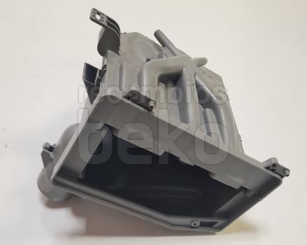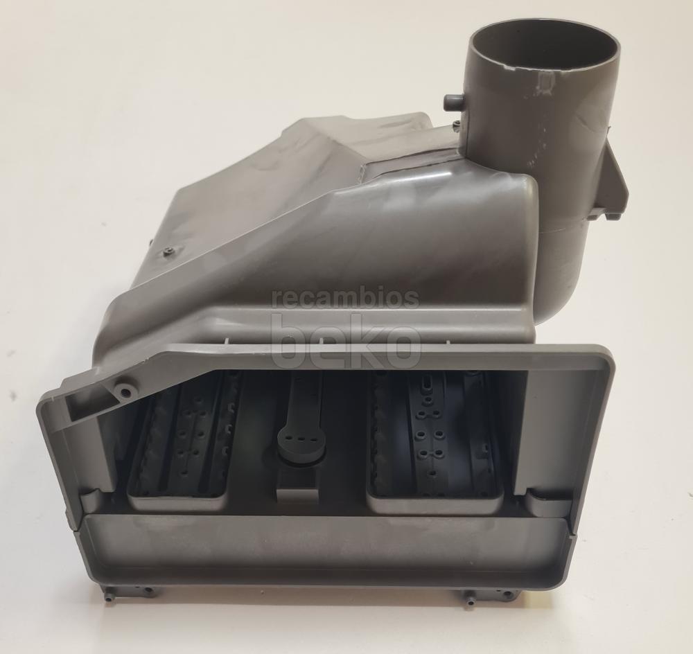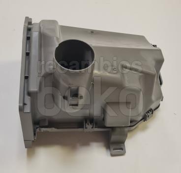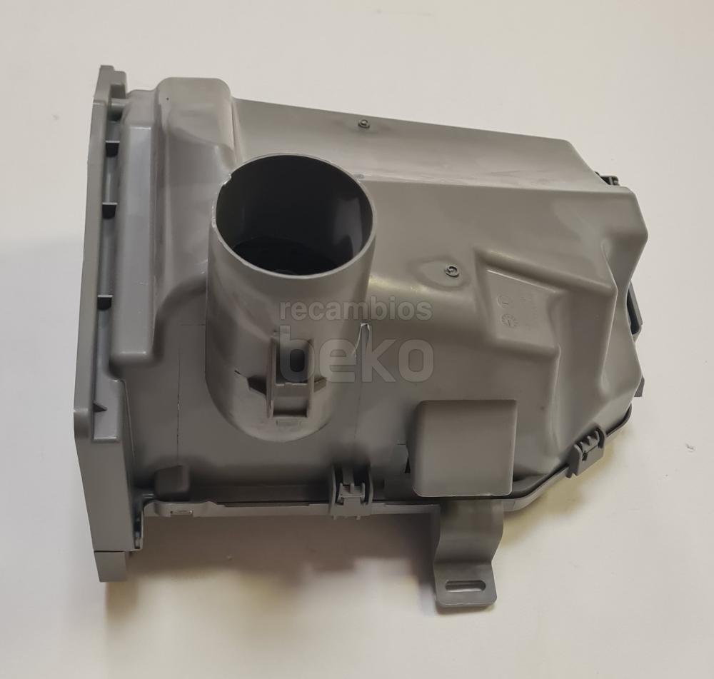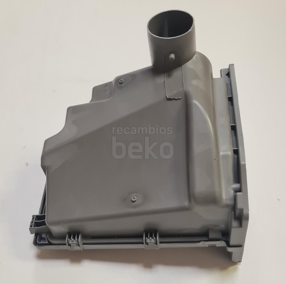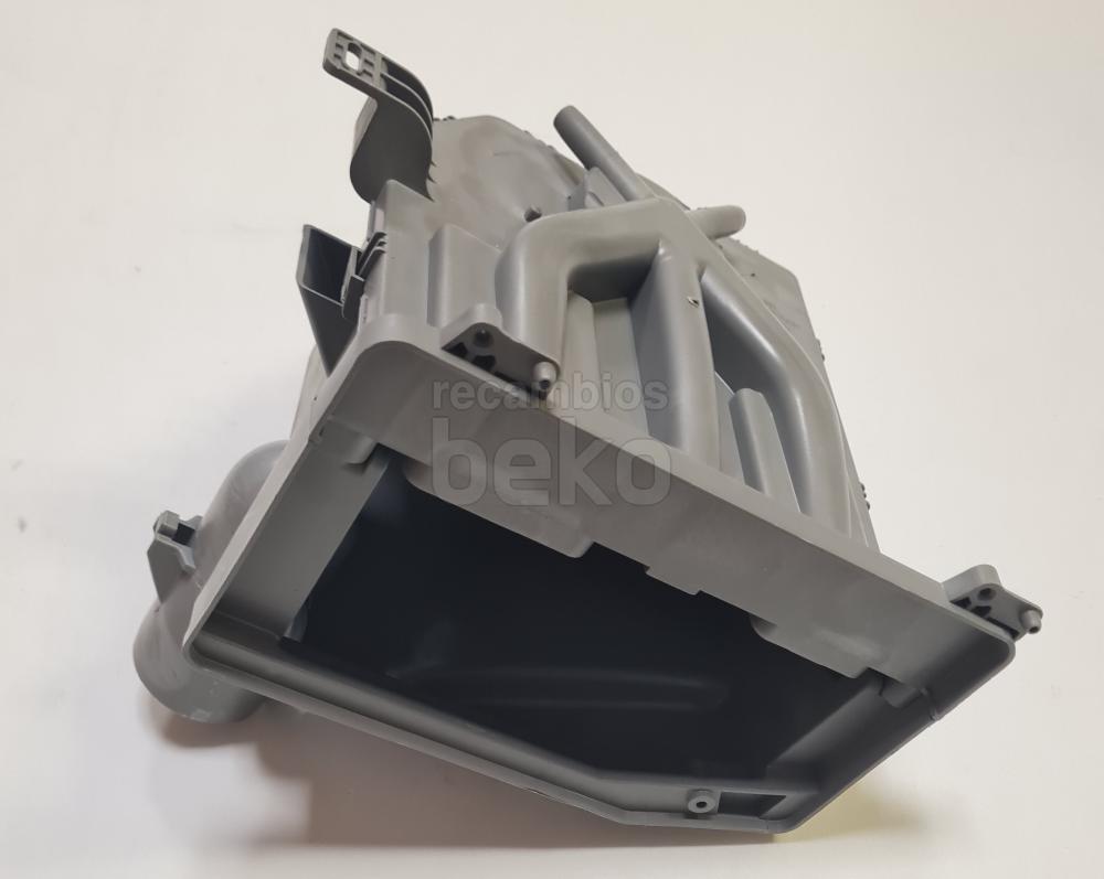Cuerpo contenedor de cubeta de detergentes para lavadoras Beko. Pieza diseñada para alojar el detergente y el suavizante en el frontal del aparato, guiando el agua hacia los distintos compartimentos durante el ciclo de lavado. Compatible con varios modelos de lavadoras y secadoras Beko; la versión puede variar según el año de fabricación del aparato, por lo que es necesario comprobar siempre la referencia de la etiqueta del electrodoméstico antes de realizar el pedido. Incluye carcasa principal con entradas de agua superiores y salidas hacia la cuba.