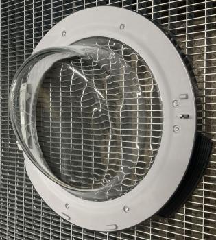 Puerta de escotilla para lavadora, compatible con aparatos Beko. Presenta marco circular y ventana transparente. Diseñada para equipos de lavado y secado de la marca Beko.