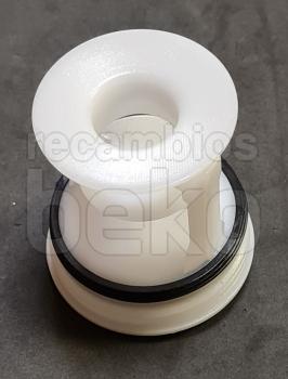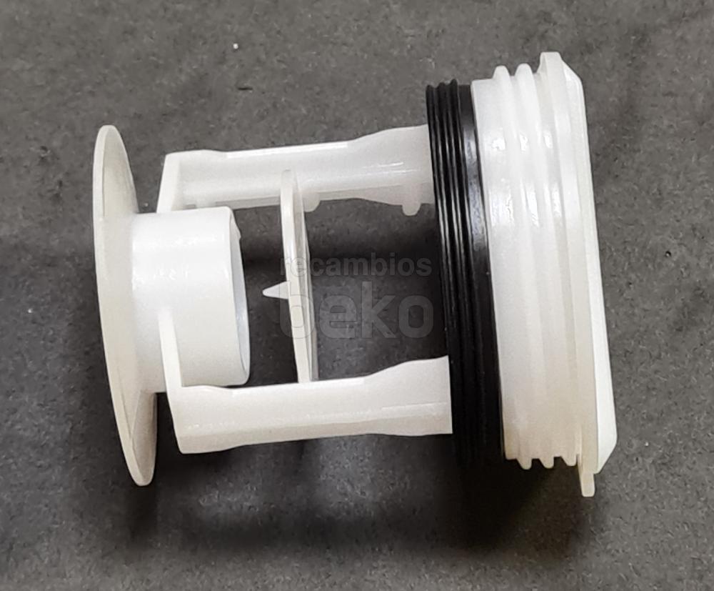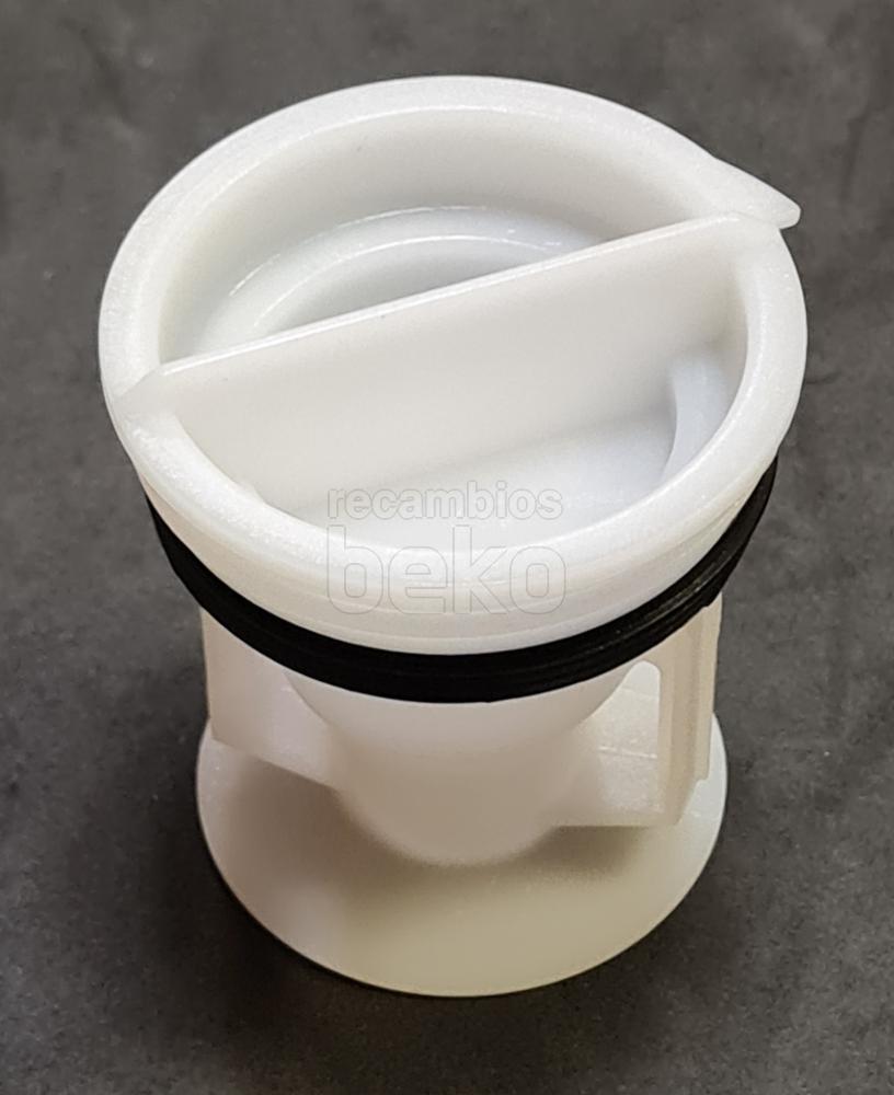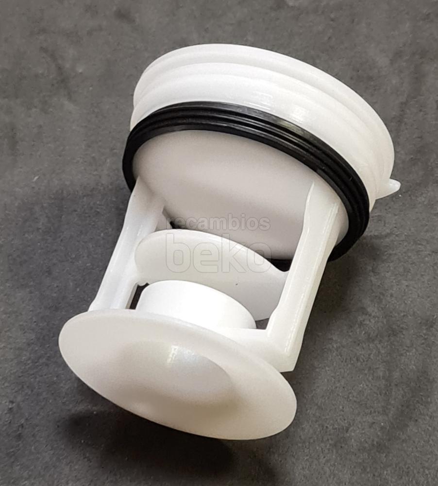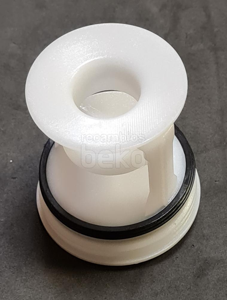 Filtro de bomba de pelusa original Beko para lavadoras de la marca Beko. Pieza de forma cilíndrica fabricada en plástico blanco, con rosca delantera para atornillar al alojamiento de la bomba de desagüe. Dispone de tapa frontal circular con agarre central para facilitar el montaje y desmontaje manual, y cuerpo alargado con rejillas internas visibles para retener pelusas y pequeños residuos. Diseñado como cabezal de bomba de desagüe, se instala en la zona frontal o inferior de la lavadora, permitiendo el acceso al filtro para su limpieza periódica sin necesidad de herramientas.