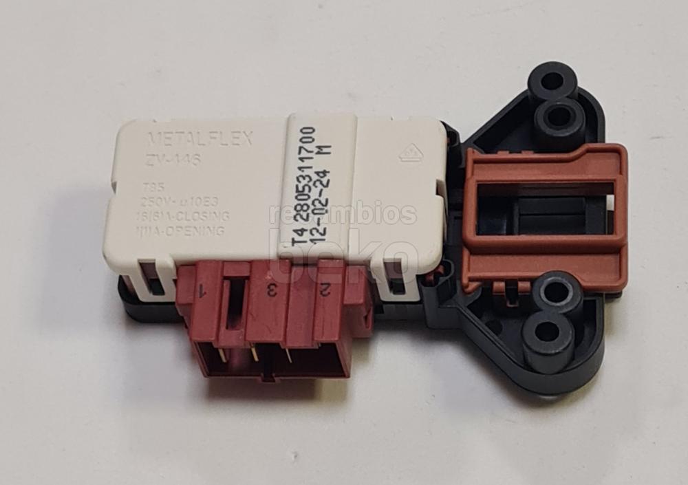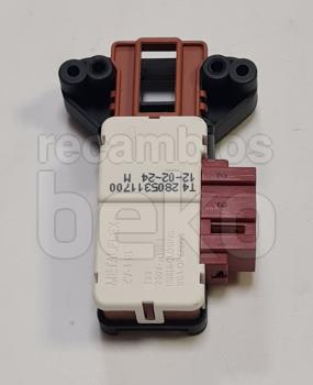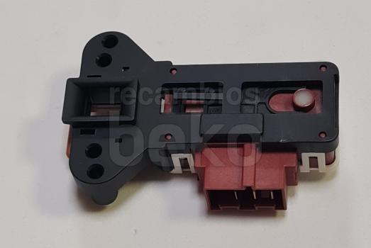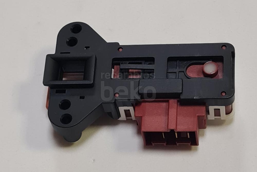 Blocapuerta Beko diseñado como interruptor de puerta para lavadoras de marca Beko. Este seguro de puerta se encarga de bloquear la escotilla durante el funcionamiento del aparato y permitir su apertura solo cuando el ciclo ha finalizado. Se instala en la zona de cierre de la puerta y se conecta al sistema eléctrico del electrodoméstico para garantizar el correcto enclavamiento y la detección de puerta cerrada.