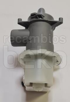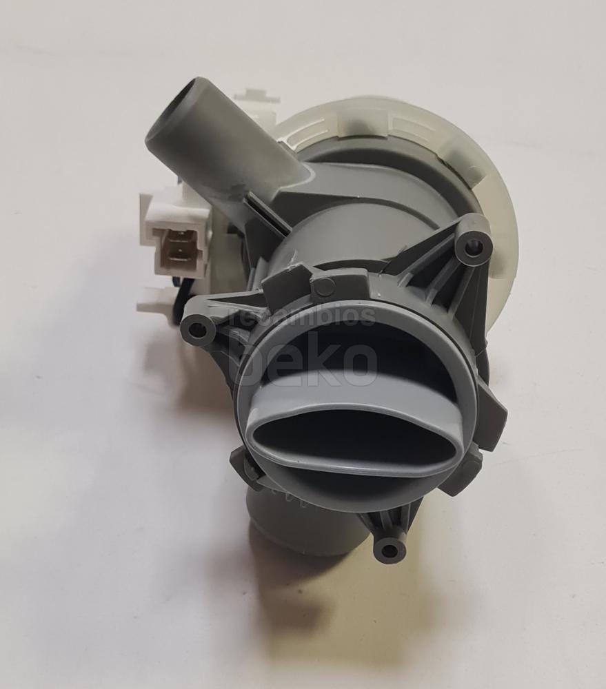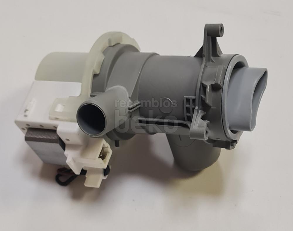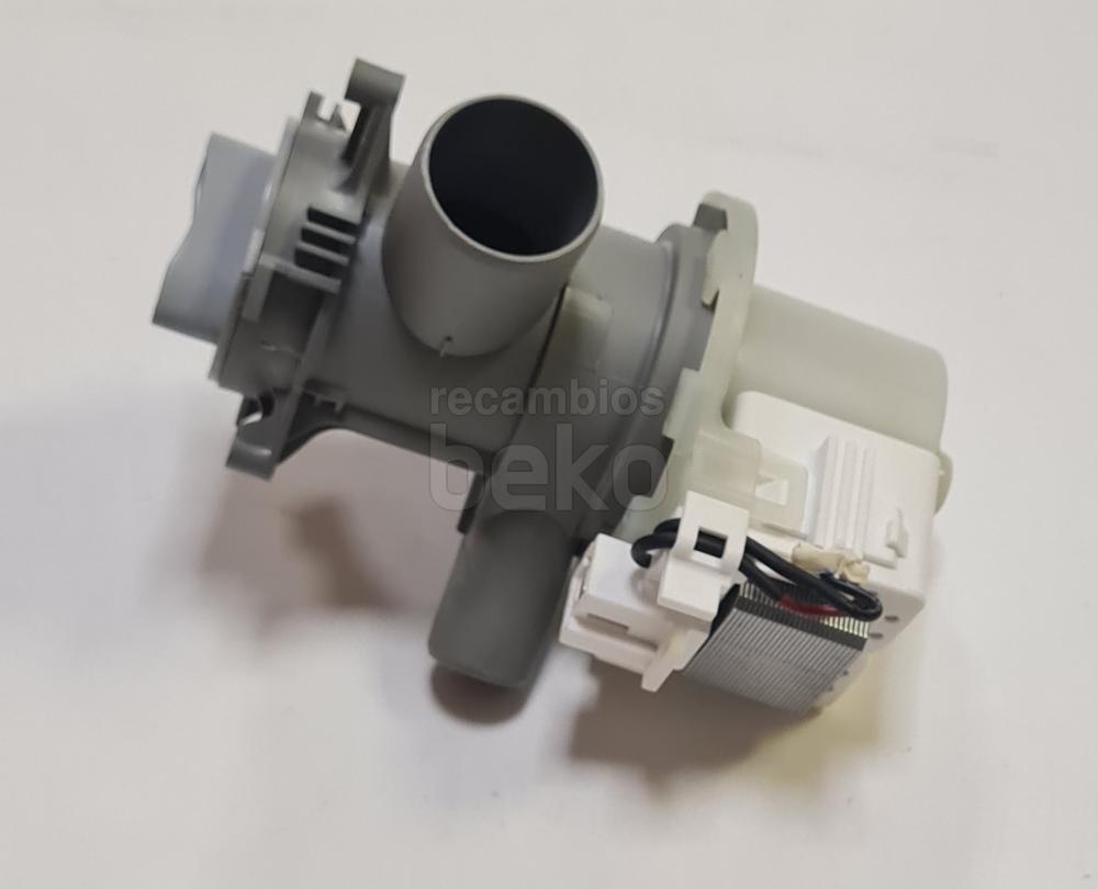 Bomba de vaciado para lavadoras y secadoras Beko fabricada por Arcelik. Diseñada para el desagüe del agua, cuenta con entrada de agua de 34 mm y salida de 22 mm. Funciona con tensión AC a 230 V y dispone de conexiones eléctricas en la parte delantera. Incluye tapa de filtro integrada para retener residuos sólidos durante el vaciado.