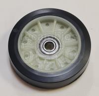 Rueda de goma tipo rodillo compatible con lavadoras y secadoras Beko. Pieza de apoyo o guía que facilita el movimiento de componentes internos del aparato durante el ciclo de lavado o secado. Diseñada para encajar en el sistema móvil del tambor.