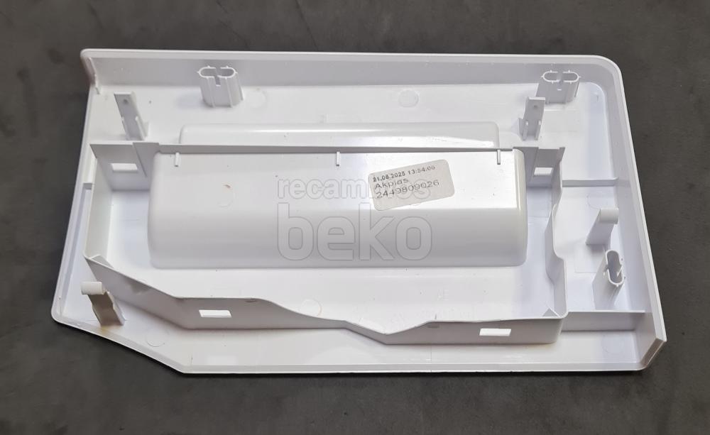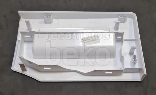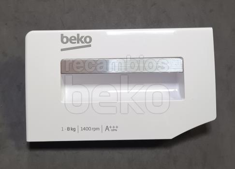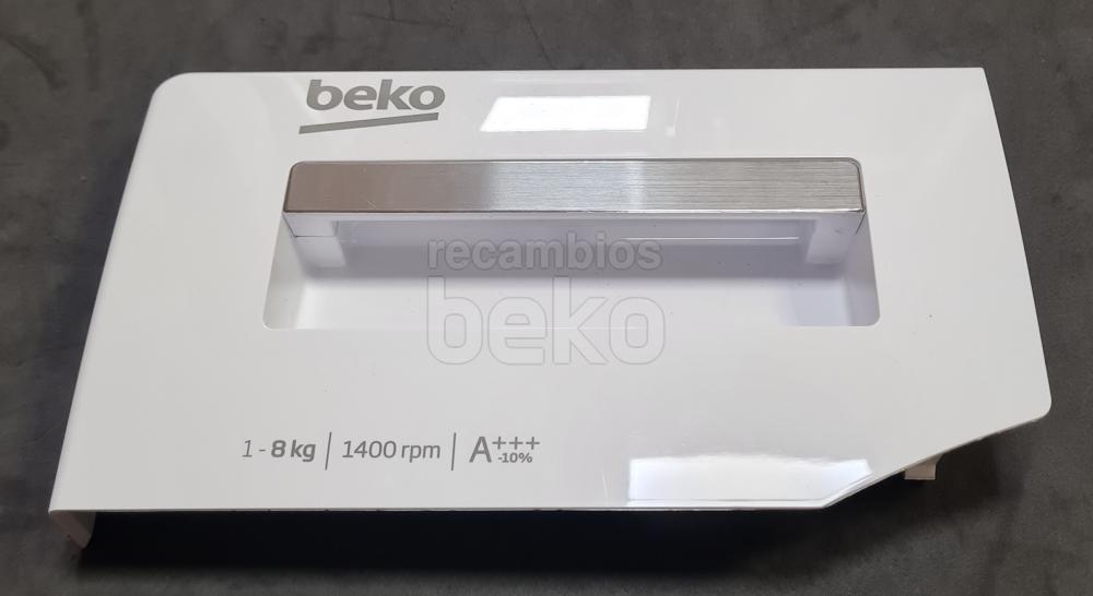 Tapa delantera de la jabonera diseñada para lavadoras de la marca Beko. Esta pieza cubre el compartimento dosificador de detergente, protegiendo el interior y guiando la entrada del jabón hacia la cubeta de lavado. Se instala en la parte frontal del cajetín de detergente, sustituyendo la tapa original dañada o perdida. Compatible con modelos Beko que utilizan cubeta de detergentes con tapa frontal extraíble.