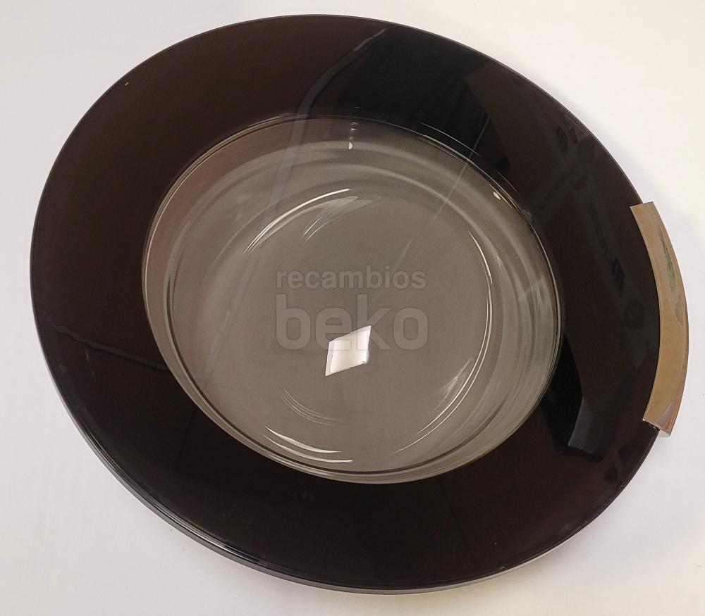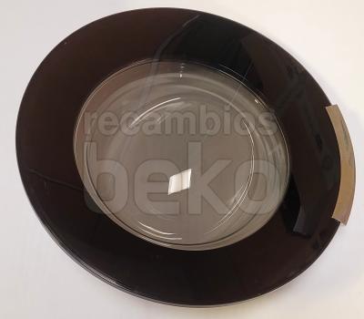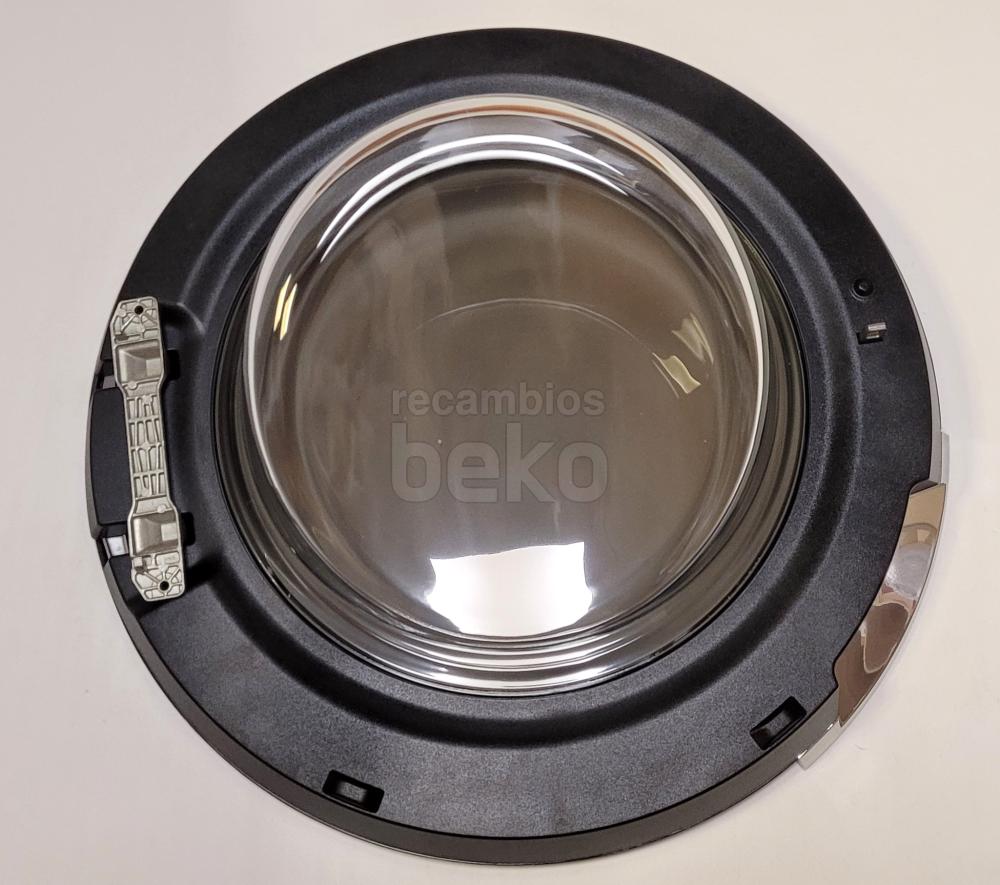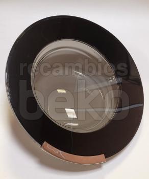 Puerta de escotilla completa para lavadoras y secadoras Beko. Consta de un marco redondo y un cristal transparente central que permite ver el interior del tambor. Incluye el conjunto de puerta listo para montar en el frontal del aparato, sustituyendo la puerta original dañada o rota. Diseñada específicamente para modelos de la marca Beko, mantiene las dimensiones y anclajes originales para asegurar un cierre correcto y un ajuste preciso en la bisagra y el sistema de cierre.