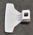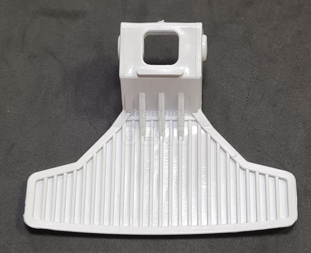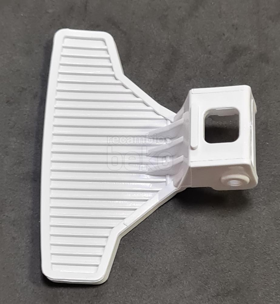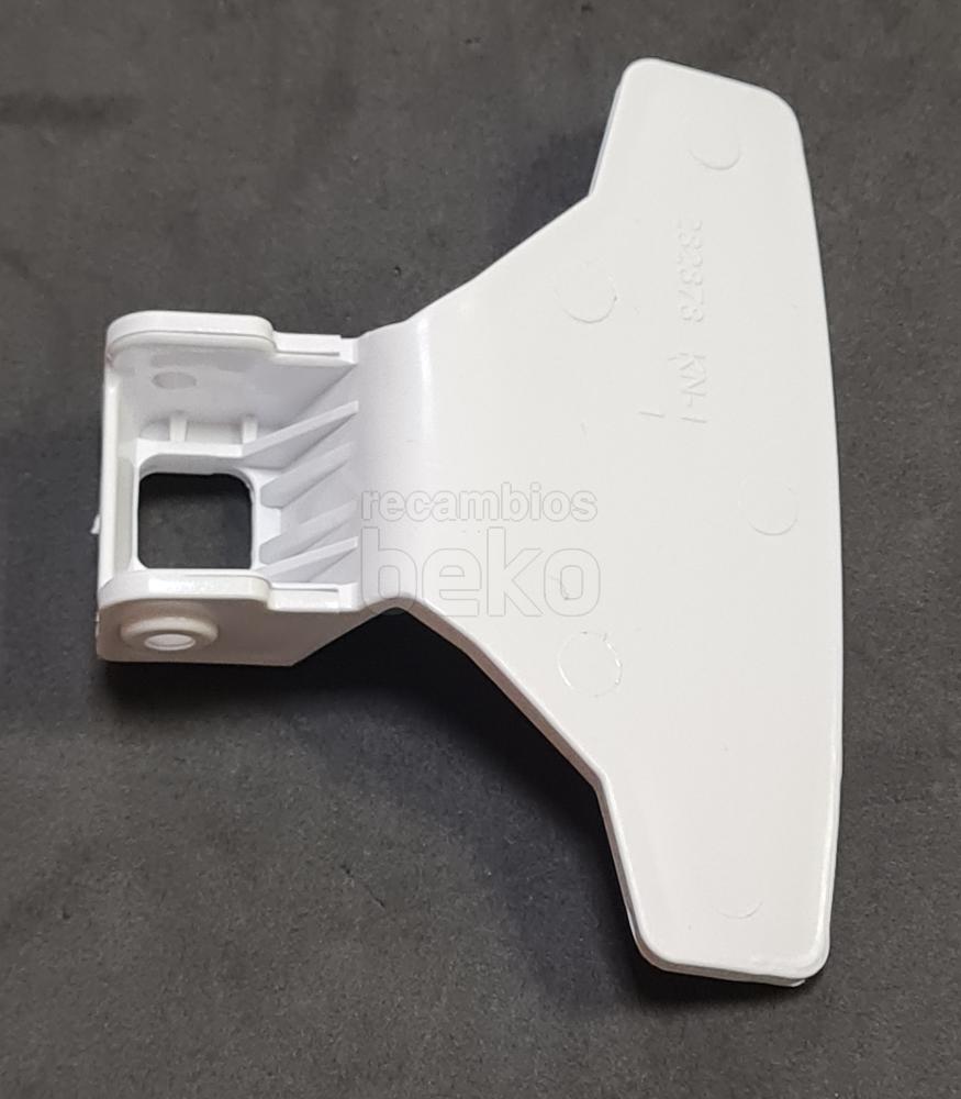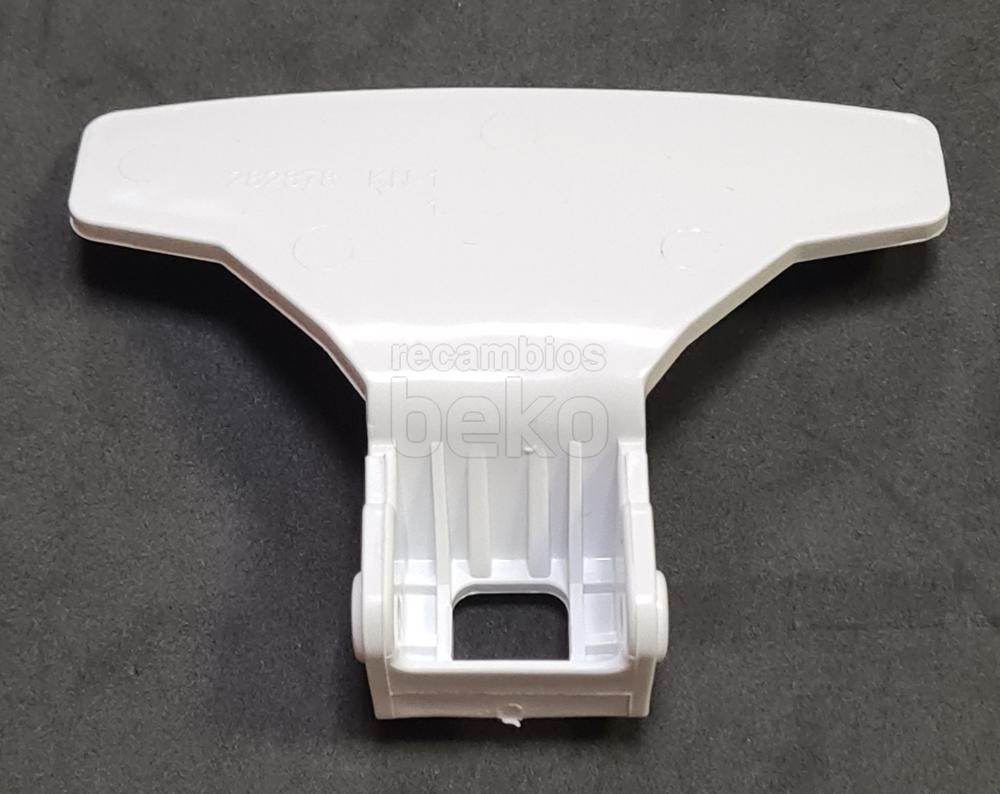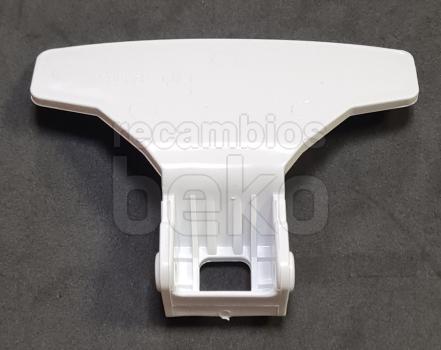 Maneta de tirador de puerta para lavadora compatible con aparatos de la marca Beko. Pieza de plástico blanco, con diseño curvo para un agarre cómodo al abrir y cerrar la puerta. Se monta en la puerta de la lavadora o secadora Beko como repuesto directo de la maneta original.