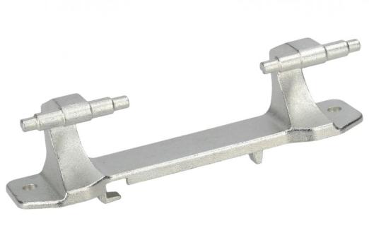 Bisagra de puerta original para lavadoras y secadoras Beko, fabricada en una sola pieza metálica con acabado gris uniforme. Presenta varios orificios de fijación para atornillarla firmemente al chasis y a la puerta del aparato.