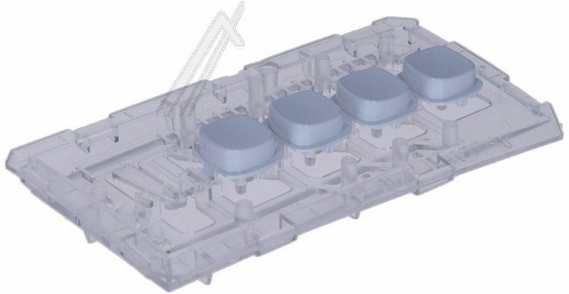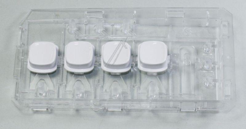 Conjunto de botón y guía de luz para lavadoras y secadoras Beko, formado por un juego de cuatro botones alineados sobre una base rectangular. Los botones son de plástico blanco e integran una guía de luz que permite el paso de la iluminación interior del panel frontal.