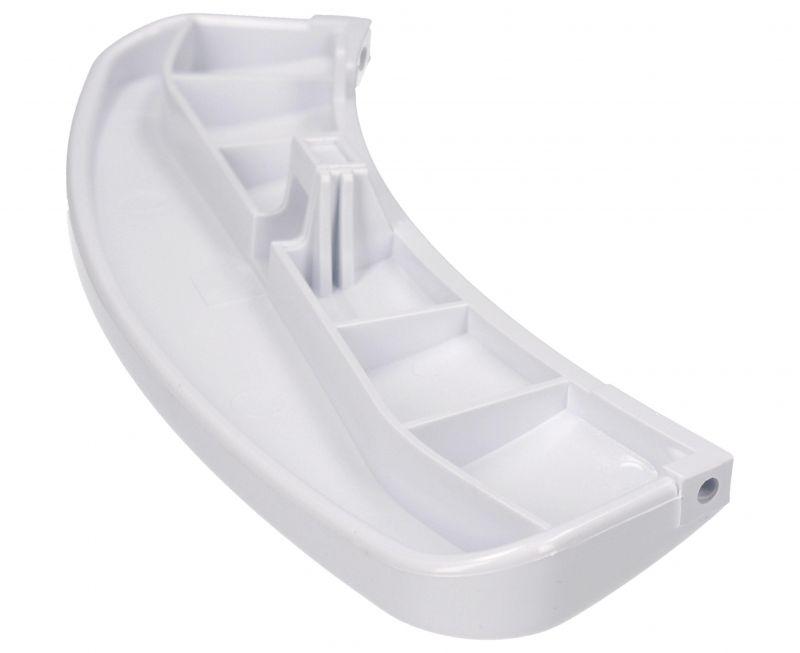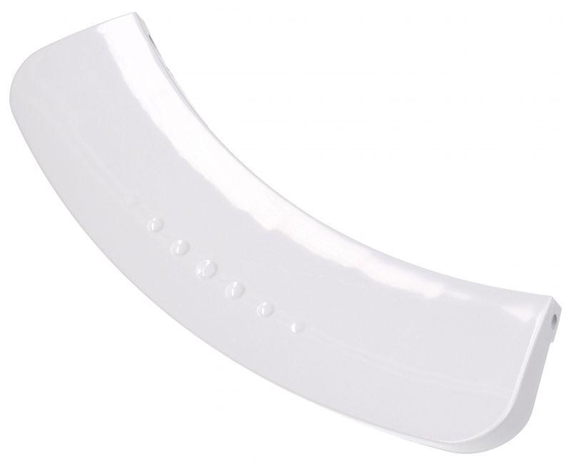Maneta de puerta blanca para lavadora Beko, diseñada como tirador curvado para la apertura y cierre de la escotilla. Fabricada en plástico con acabado liso y uniforme, se instala en el frontal de la puerta de la lavadora o secadora compatible de la marca Beko como pieza de recambio específica.