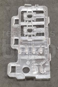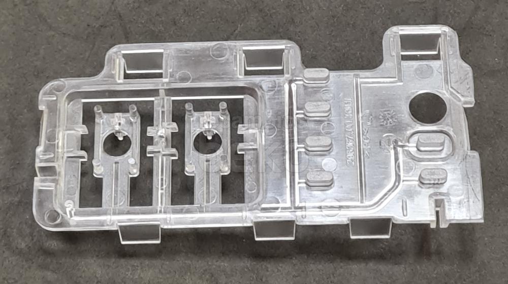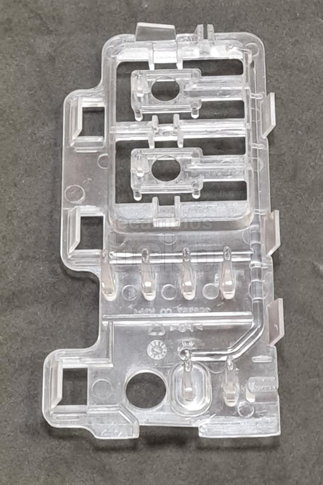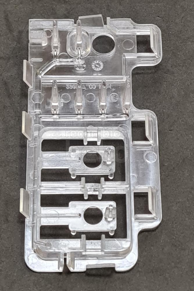 Conjunto guía de luz original para lavadoras y secadoras Beko. Pieza plástica pequeña, alargada y rectangular. Diseñada para canalizar o posicionar la iluminación o el piloto luminoso en el interior del aparato, asegurando el correcto paso de la luz en la zona prevista por el fabricante.
