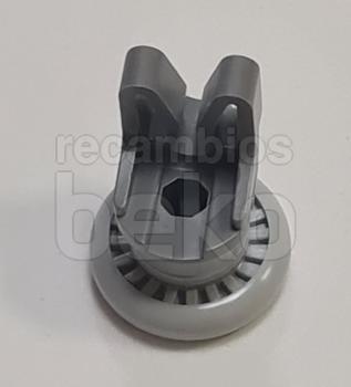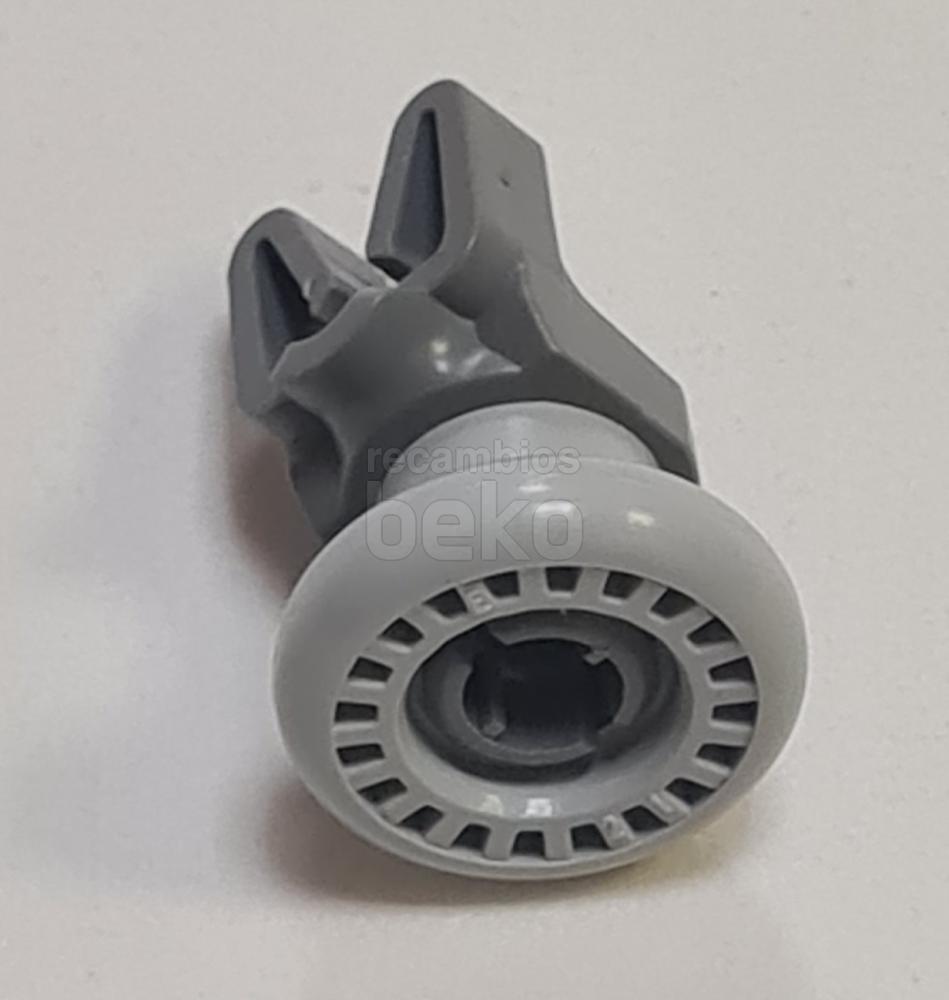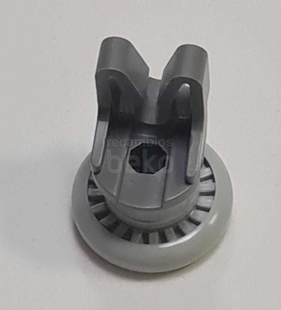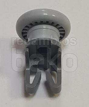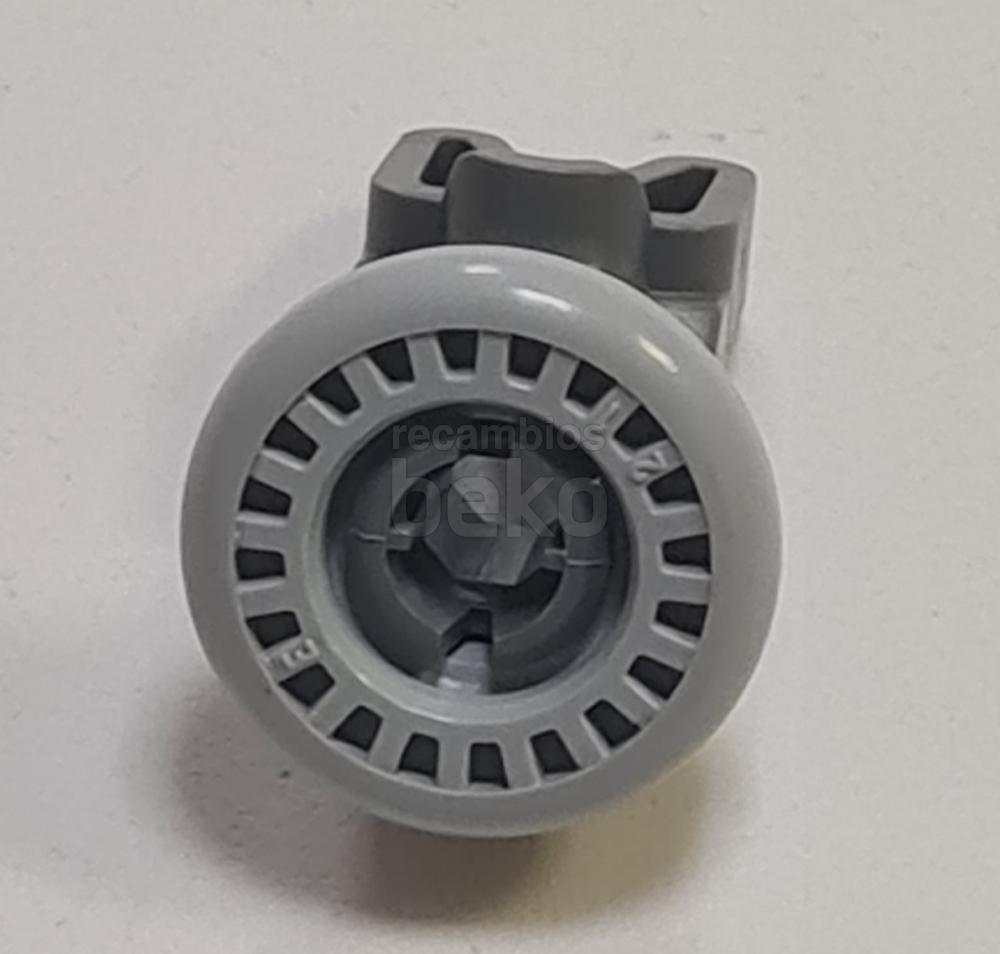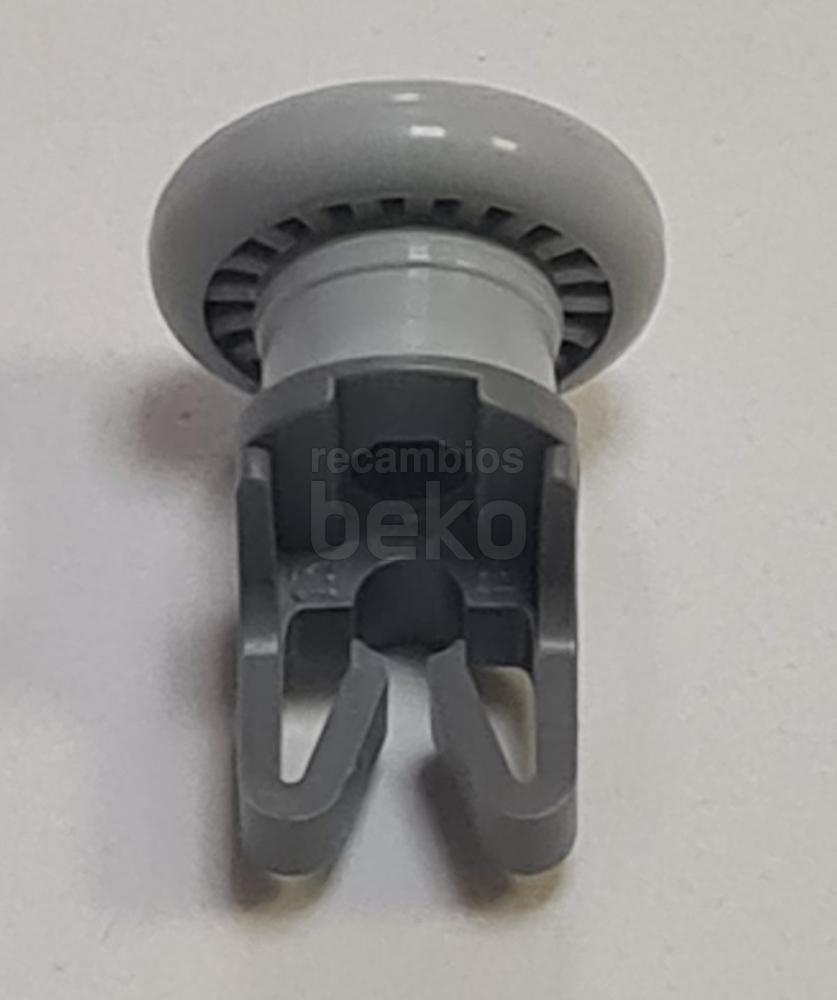 Rueda para cesta superior de lavavajillas Beko. Pieza de recambio formada por una pequeña rueda unida a una pieza de anclaje con eje y pestañas de sujeción integradas. Diseñada para fijarse en la cesta y permitir su deslizamiento suave hacia dentro y fuera del lavavajillas.