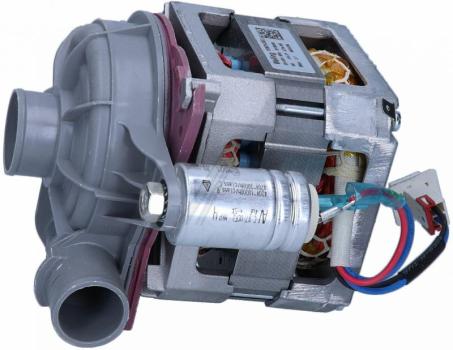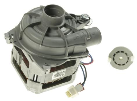Bomba de circulación para lavavajillas Beko, compuesta por un motor eléctrico de 94W integrado en un cuerpo cilíndrico de plástico con carcasa gris. Dispone de dos conexiones de manguera de distinto diámetro para el paso del agua, con entrada de 34 mm y salida de 29 mm, y funciona con tensión AC a 230V. La unidad va montada sobre una base plástica con soportes y pestañas de fijación para su correcta sujeción en el interior del lavavajillas.