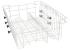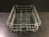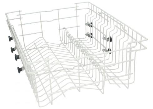 Cesta superior para lavavajillas Beko de color blanco, diseñada para alojar vajilla y utensilios en la parte alta del aparato. Fabricada con estructura de alambre recubierto y equipada con ruedas laterales de plástico que permiten un deslizamiento suave por las guías internas del lavavajillas.