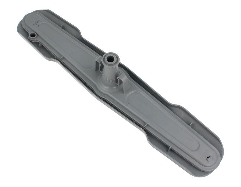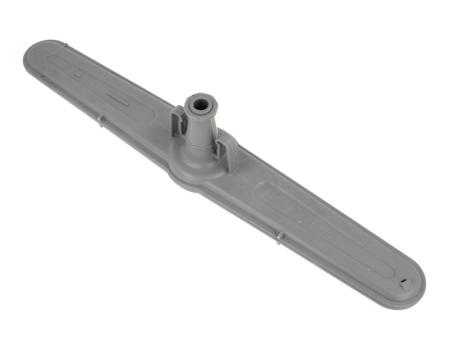 Brazo aspersor inferior para lavavajillas Beko, diseñado para la distribución uniforme del agua durante el ciclo de lavado. Pieza alargada y plana de plástico gris, con múltiples orificios de salida de agua repartidos a lo largo del brazo y orificio central de acople para su fijación en el lavavajillas. Adecuado como recambio directo del brazo de vaporizador inferior original del aparato.