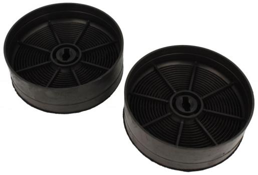Par de filtros circulares de carvão ativado para exaustores Beko. Cada filtro é preto, com ranhuras radiais e centro perfurado, e mede aproximadamente 4,1 cm de altura e 12,5 cm de diâmetro. O conteúdo da embalagem inclui 2 unidades de filtros de carvão ativado concebidos para a recirculação do ar em exaustores.