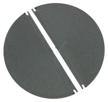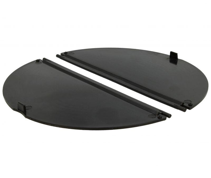 Válvula de retenção Beko em forma de tampa para exaustores. Peça plana com bordas arredondadas numa das extremidades, fabricada em plástico rígido. Apresenta ranhuras e relevos técnicos na superfície para encaixar corretamente no conduto de saída de ar e impedir o retorno do mesmo quando o exaustor não está em funcionamento.